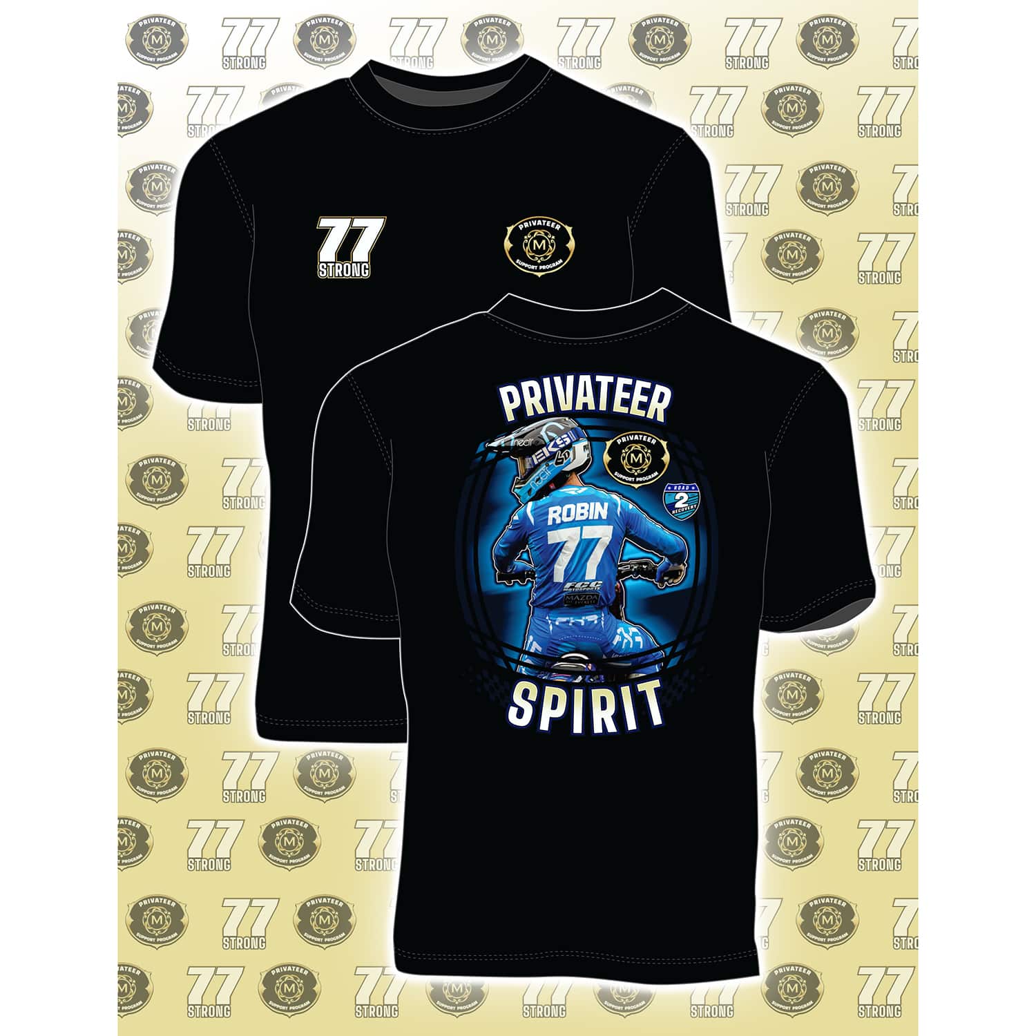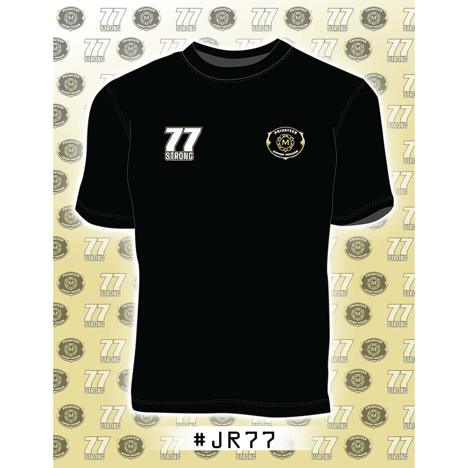 #77 with this cotton tee, available in Adult sizes small – XXL. #77Strong
