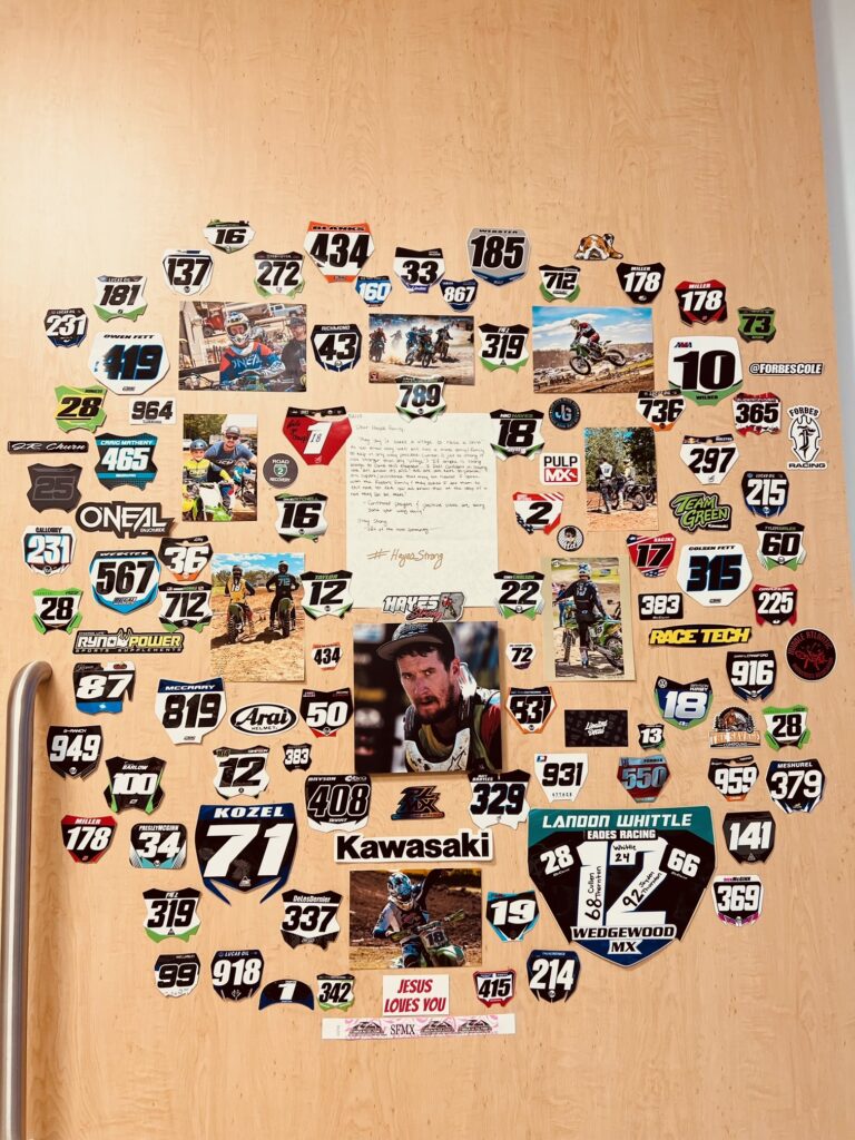 He has been entirely off the ventilator since August 18th. We have slowly weaned his oxygen off, and he is tolerating his new trach valve and already handling the trach being capped throughout the day. It’s so wonderful to hear his voice! Although we are adjusting to the physical change, Nic’s mind has not stopped. He continues to be involved with his business as much as possible from his room. Nic continues to make light through all of the changes. His smile and humor are still contagious. We have been working on a motivational/support wall with all fellow riders sending in their number plates or decals. It has brought Nic such joy to see all the people supporting him; each number or sticker shares a story. We love to recap and talk a little more. We’ve had a couple of visitors as well as Nic can tolerate. Each day, Nic is getting stronger and more confident.