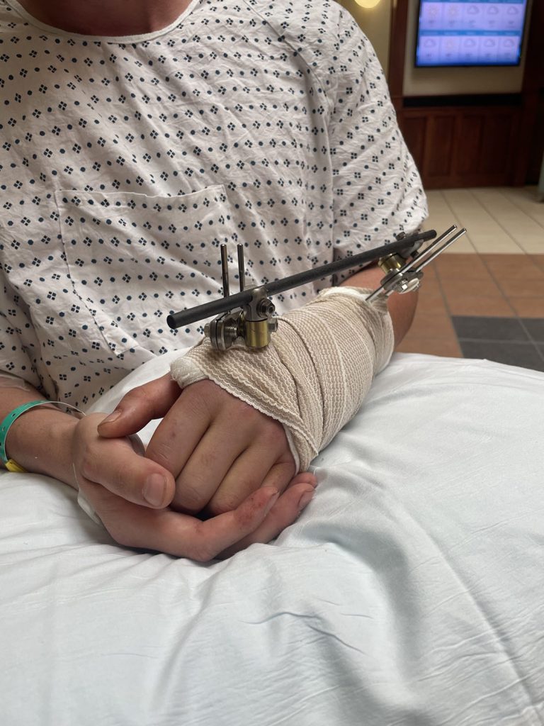 After arriving at Carolina East Hospital, the Orthopedic Surgeon assessed his injuries and performed the first surgery to clean and stabilize his wrist. Two days later, on November 4, Bobby was transferred to Vidant Medical Center, where he underwent another surgery. The Orthopedic surgeon performed multiple procedures focusing on nerve recovery and a Scaphoid Fracture Open Reduction and Internal Fixation to give him the best outcome for future mobility and strength. With the severity of his injuries, the doctors are concerned that he will suffer permanent nerve damage resulting in numbness, limitation in range of motion, and strength with long-term wrist instability.