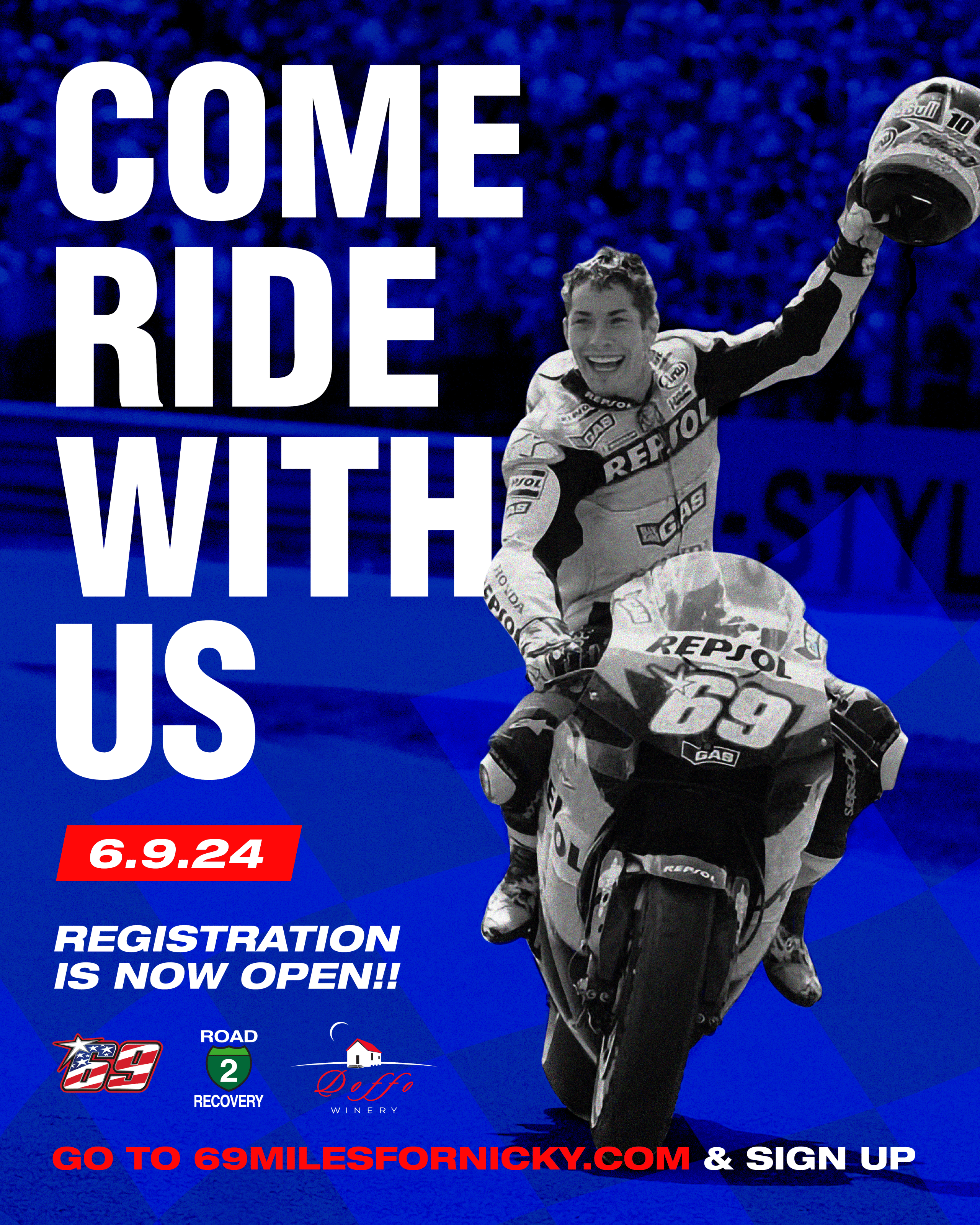 Doffo Winery 36083 Summitville St, Temecula, CA, United StatesJoin us on June 9th as we embark on a 69-mile cycle ride to honor the legendary Nicky Hayden. This year, we're thrilled to traverse the scenic routes of Temecula, starting and concluding our ride at the breathtaking Doffo Winery. Registration is NOW open at 69MilesForNicky.com! While you're there, don't forget to add the brand-new 2024 cycling jersey, custom designed by Pedal Mafia, to your cart! If cycling isn't your forte, join us for the post-ride celebration, featuring catered lunch, raffles, live music, and Nicky Hayden memorabilia. We eagerly anticipate your participation once again in the 69 Miles for Nicky Ride as we come together to commemorate the enduring legacy of Nicky Hayden! All proceeds from the event will benefit Road 2 Recovery, supporting our mission to aid injured athletes. Your participation and support make an impactful difference in the lives of injured athletes. See you on June 9th at Doffo Winery in Temecula! For more information, visit 69MilesForNicky.com. DOFFO WINERY 36083 Summitville ...Read More